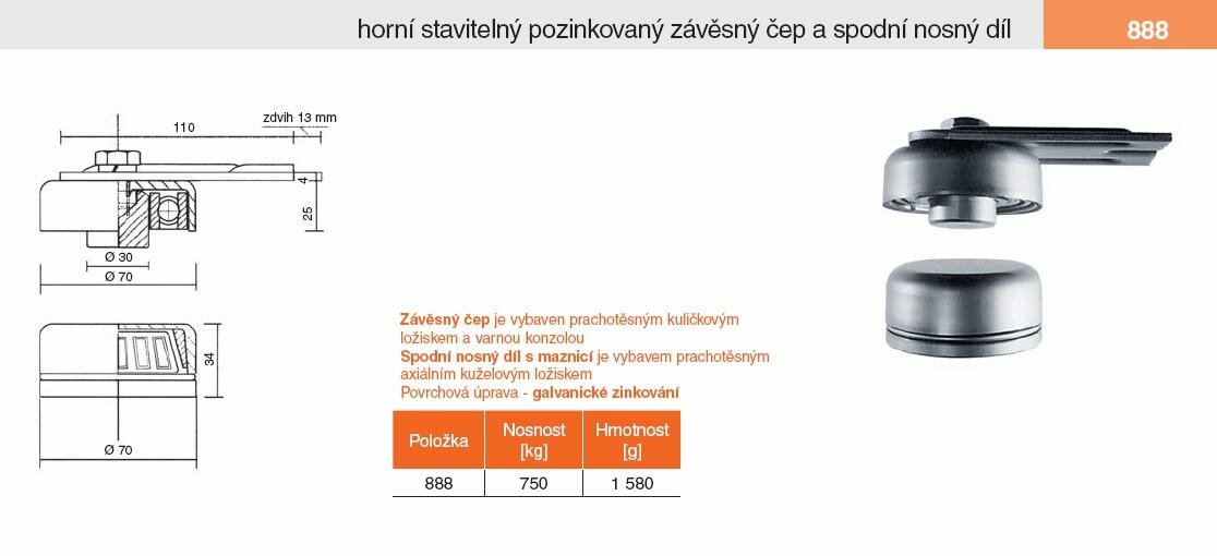 888 - regulovatelný závěsný čep pro křídlo brány, nosnost 750 kg. Více informací viz. obrázek níže.