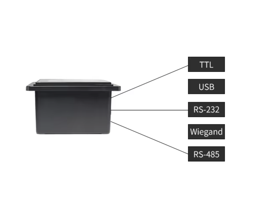Podpora několika rozhraní (nutná poptávka do výroby, termín dodání cca. 6-9 týdnů) základní verze je USB, ostatní rozhraní jsou na objednávku: TTL, RS232, Wiegand a RS485 umožňuje snadnou integraci do různých systémů.