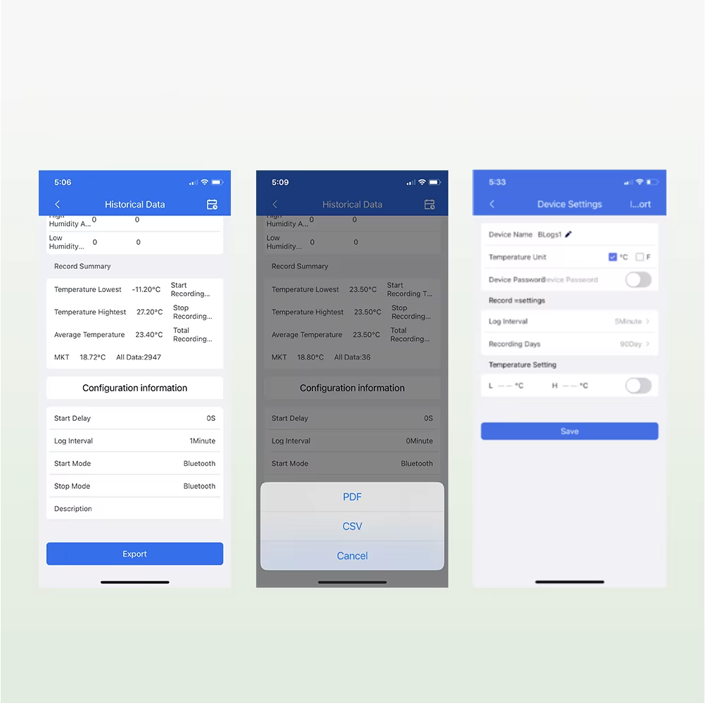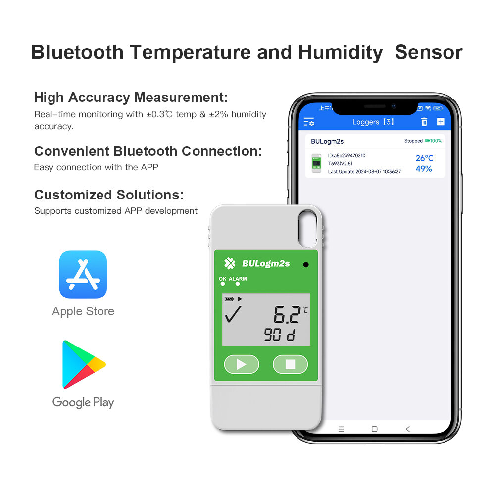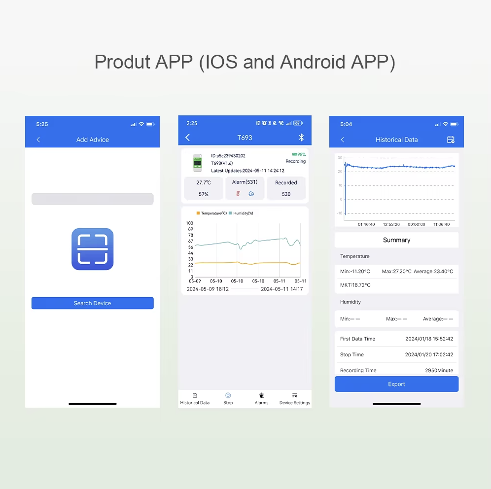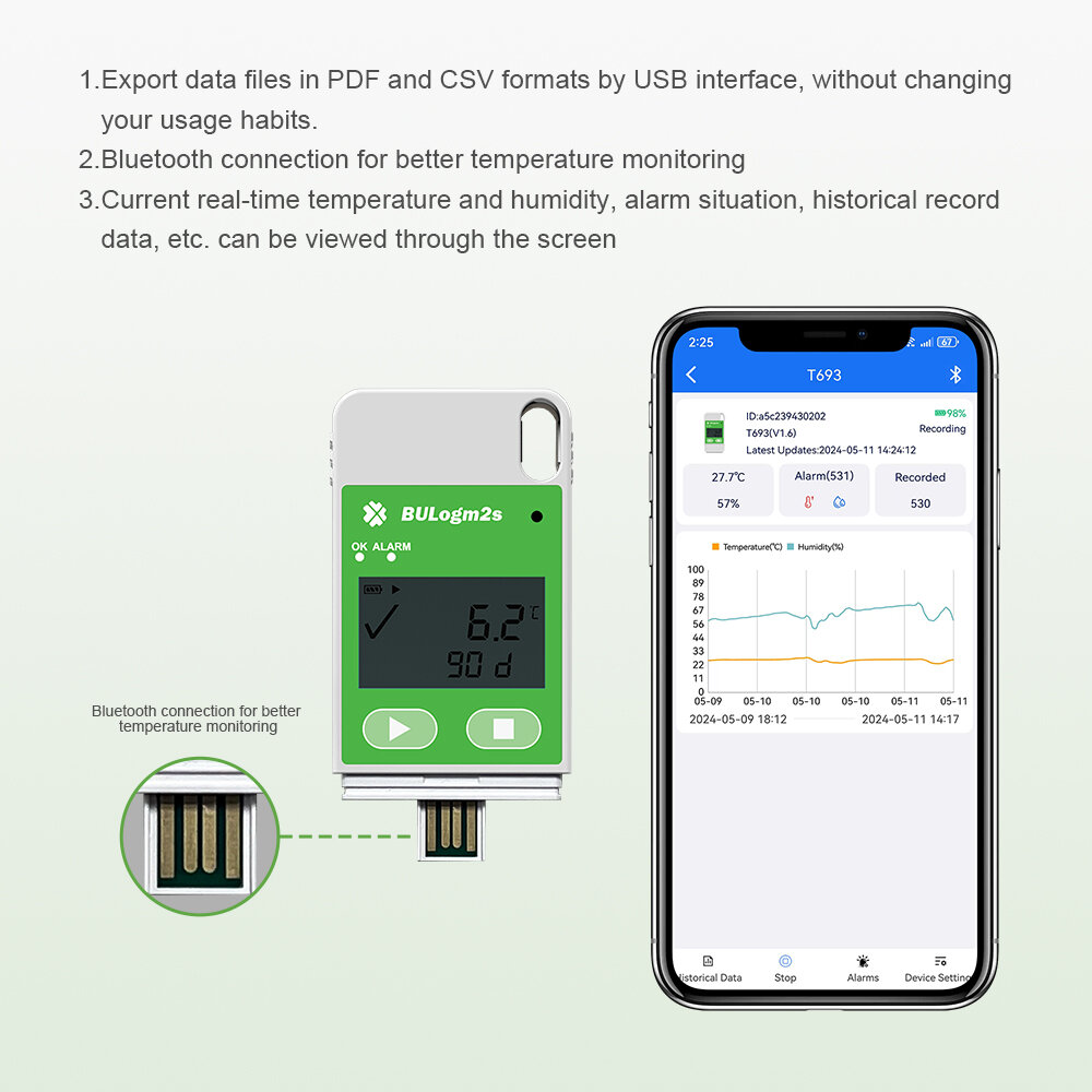 Spojení dataloggeru s vaším telefonem je zajištěno pomocí Bluetooth (spolehlivé a rychlé). V aplikace pak vidíte aktuální teploty a vlhkost, historii měření, alarm, pokud by došlo k neobvyklým teplotám a další.