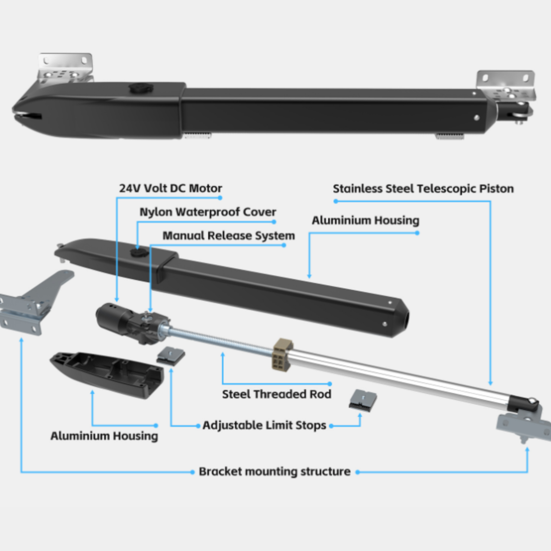 Tělo pohonu je vyrobeno z hliníku a nerezové oceli, což mu dodává dlouhou životnost i odolnost proti povětrnostním vlivům. Díky krytí IP55 pracuje spolehlivě i v dešti, prachu a teplotách od -20 °C do +55 °C.