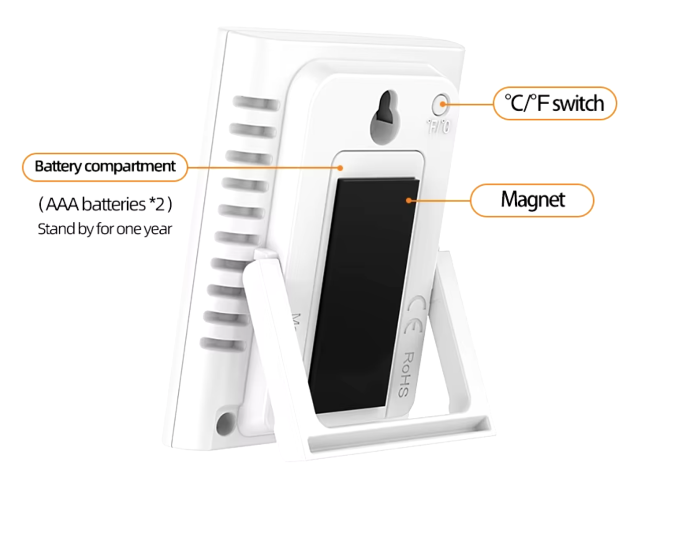 Chcete si teploměr postavit na stůl nebo poličku? Stačí vysunout podstavec. Díky magnetu si jej pak můžete snadno připnout na ledničku nebo na jakýkoliv kovový povrch.