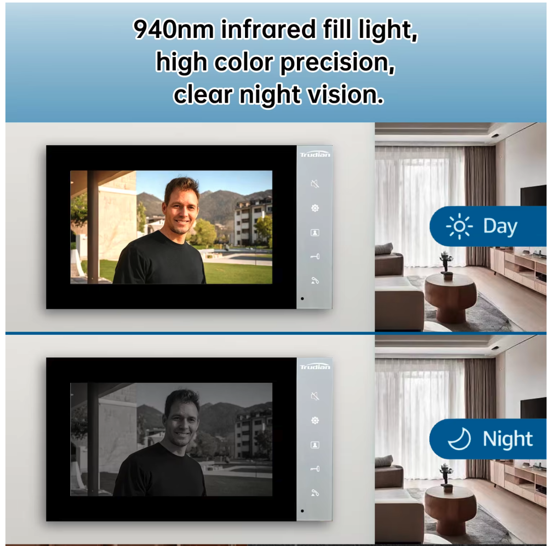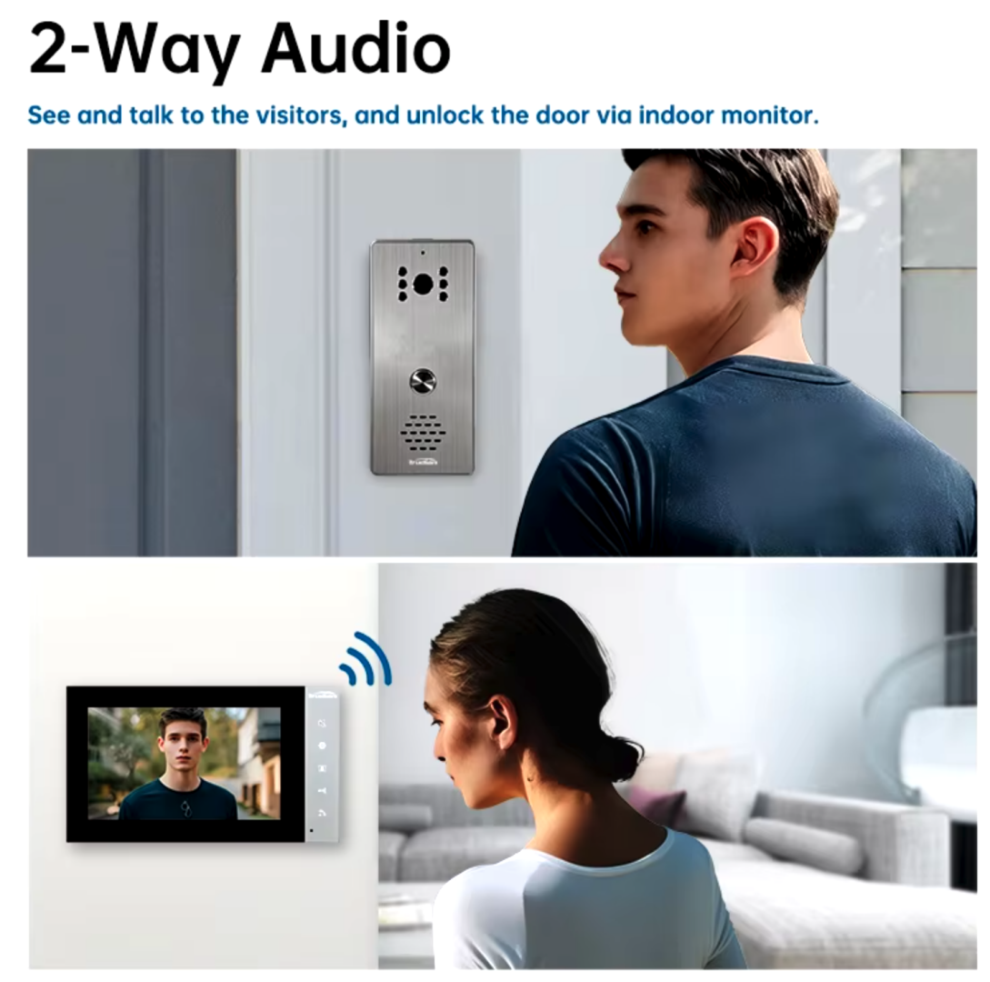 Stylový videotelefon za skvělou cenu. Displej s velikostí 17,78 cm, úhlem záběru kamery 60° až 110°, nočním viděním, barevným displejem a citivou klávesnicí ochrání váš domov před nezvanými hosty.