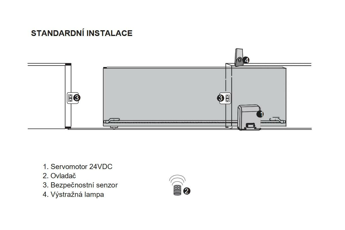 Sada pohonu BOXER pro posuvné brány do hmotnosti 500 kg. Pohon obsahuje vestavěnou řídící jednotku s integrovaným přijímačem a má mechanické koncové spínače. Pohon je vybaven mechanickým odblokováním pro případ výpadku elektrické energie. Pohon disponuje všemi běžnými funkcemi, např. poloautomatický nebo automatický režim.