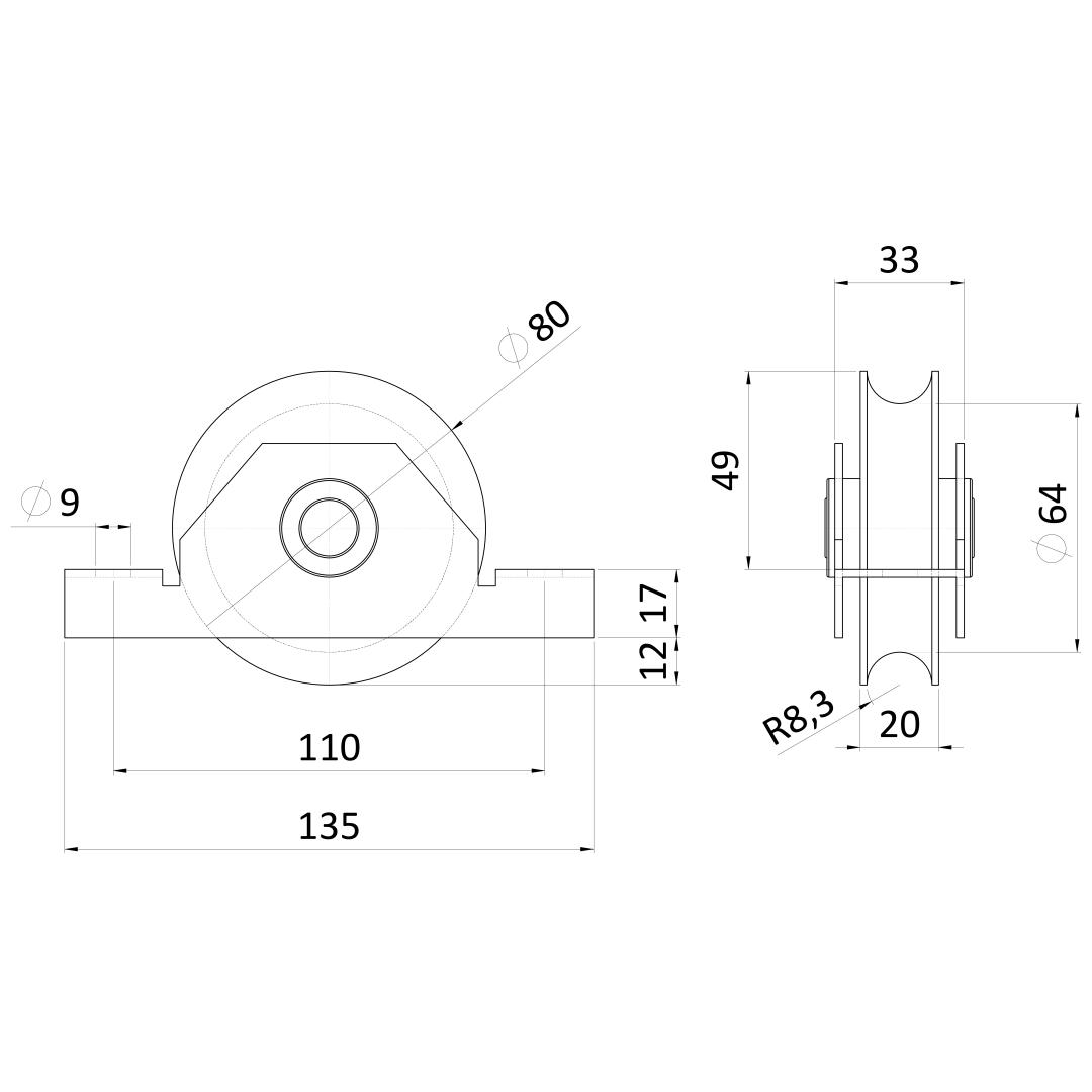 C425IX/80/16 Kladka ø 80 mm pro zapuštění do jeklu, O profil, nosnost 200 kg, nerezová / AISI304