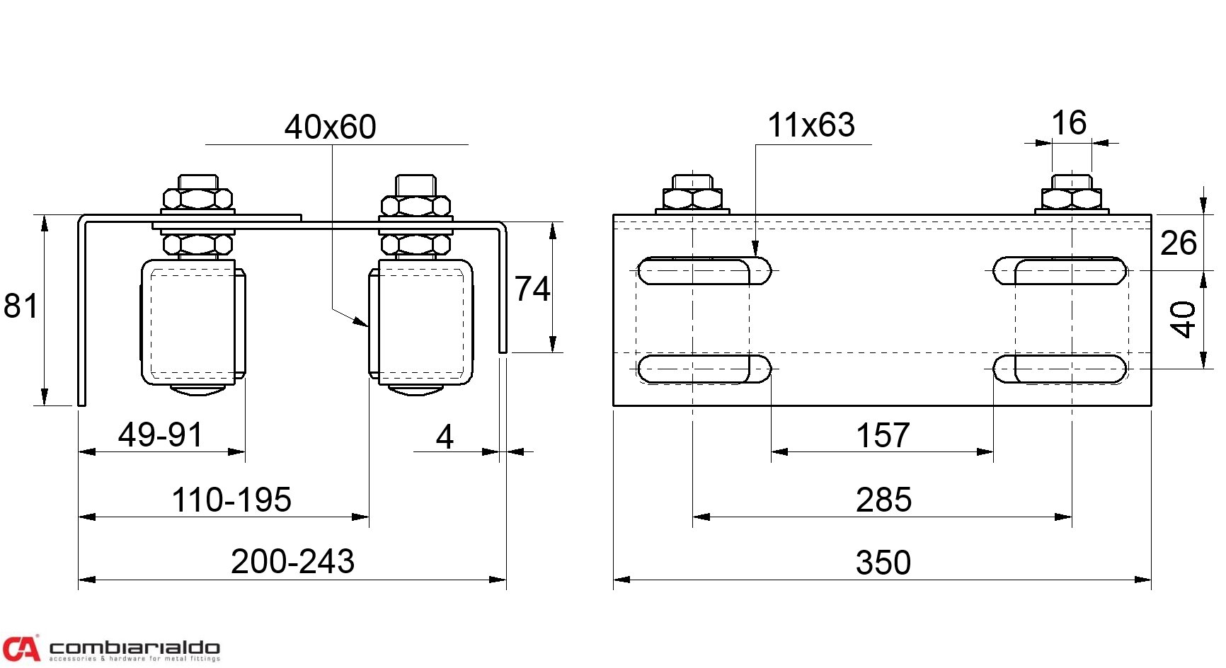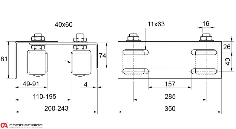Horní vedení brány Combi Arialdo, 4 vodící nylonové kladky 40 x 60 mm, M16.