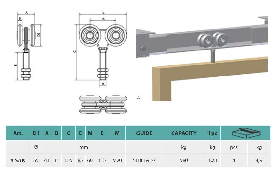 Závěsná čtyřkolečková ložisková kladka 4 SAK do profilu typu STRELA 57 mm o průměru 55 mm, nosnost páru těchto kladek je 580 kg. Více informací včetně rozměrů níže v obrázku. Držák DM 20.