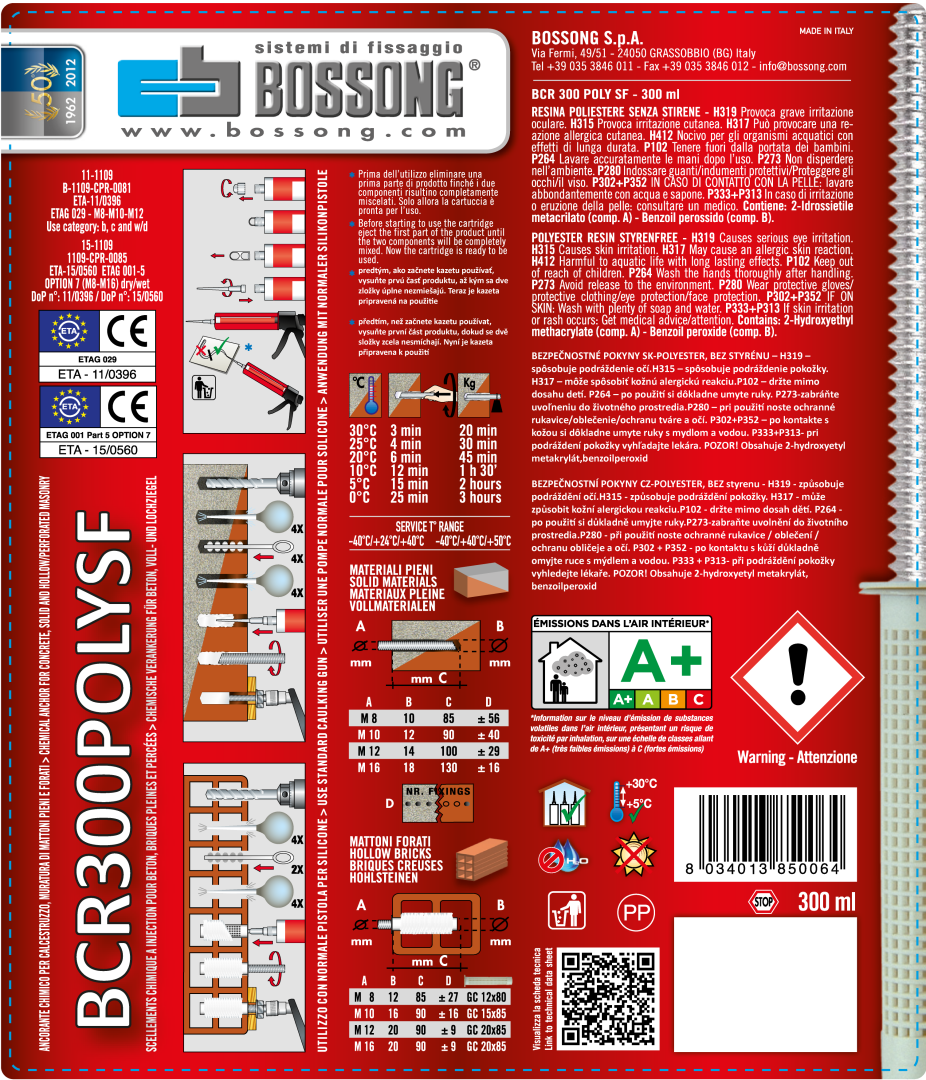 Chemické kotvení 300 ml, polyesterové, bez styrenu, se směšovacím hrotem, vhodná pro použití v interiéru     BCR 300 POLY SF-300ml, BEZPEČNOSTNÍ POKYNY CZ-POLYESTER, BEZ STYRÉNU – H319 –… více v popisu produktu