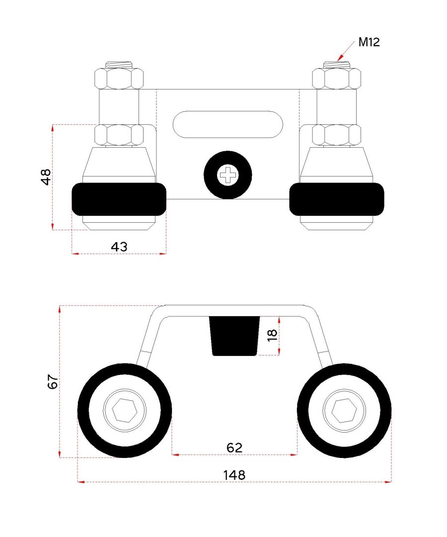 Horní doraz s vodícími gumovými kladkami 60 mm.