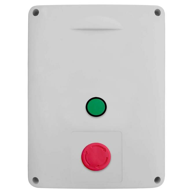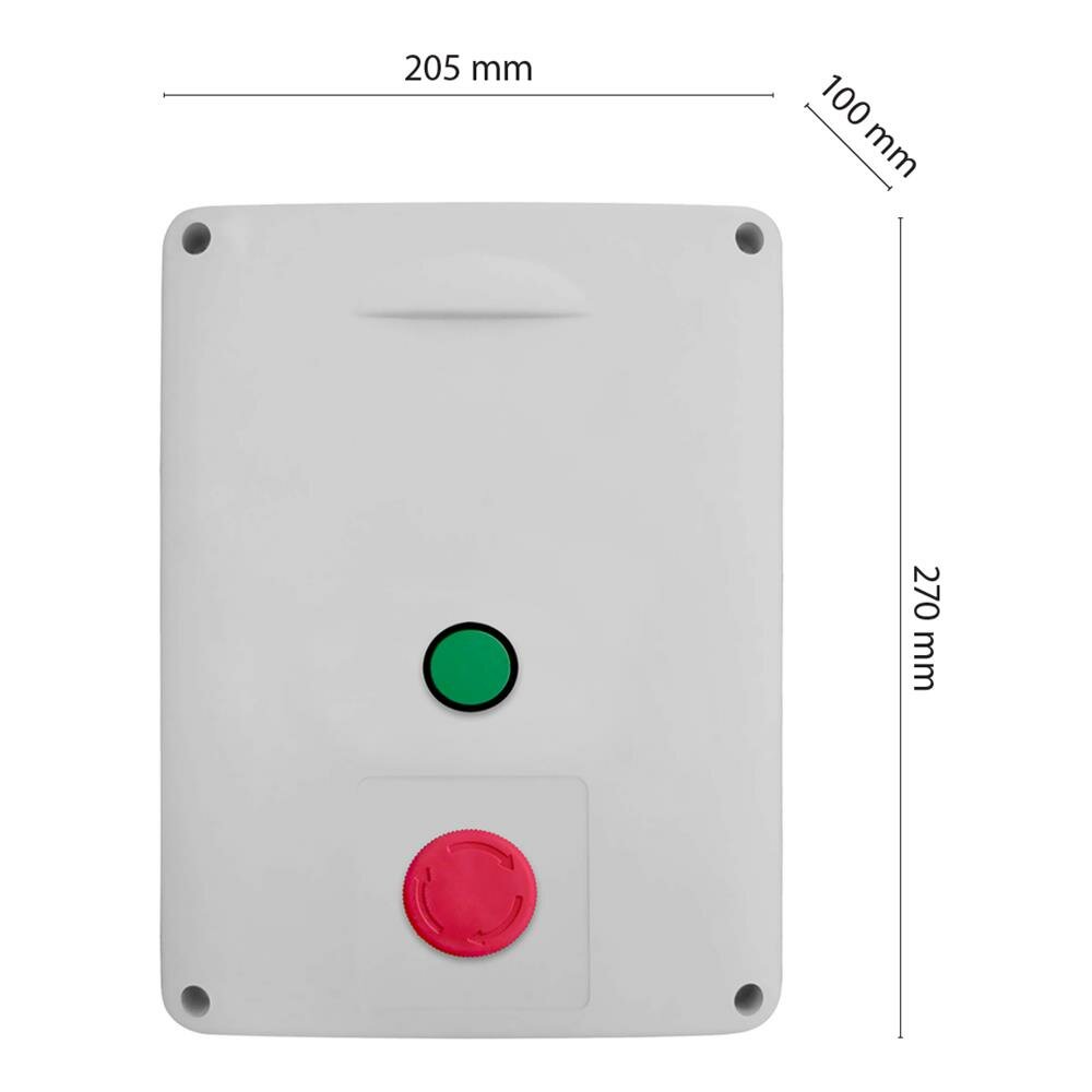 Ovládací skříňka s tlačítkem START a nouzovým tlačítkem STOP o rozměrech 270 mm na výšku a 205 mm na šířku.