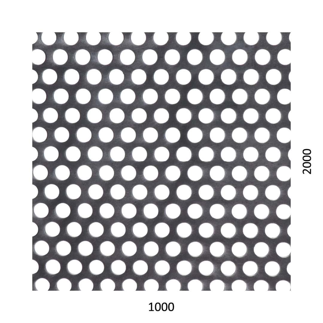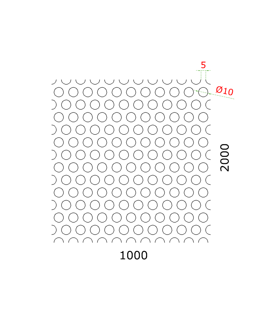 Děrovaný plech kruhový přesazený Fe, otvor: ø 10 mm, rozteč: 15 mm, (2000x1000x1 mm)