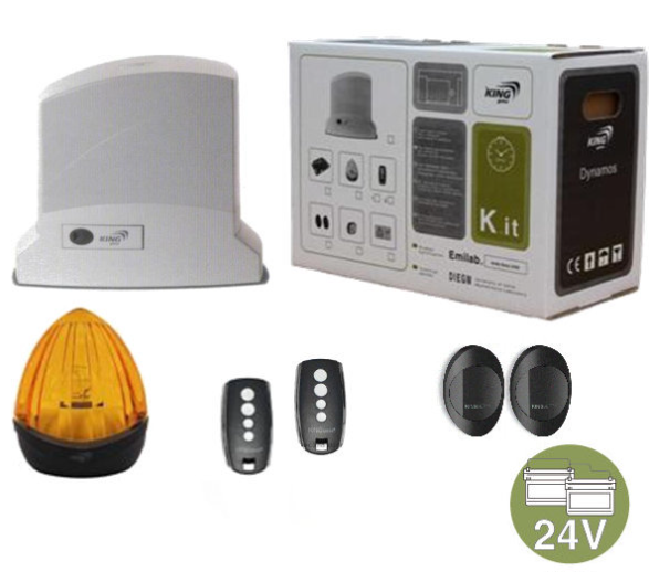 Full kit 24Vdc 1000kg: (1) 23S055 DYNAMOS24/1000, built in control unit, mechanical limit switches (2) 10S001 STYLO4K radio transmitter Rolling code 4 channels, 433,92 MHZ (1) 14S034 IDEA24-24VBP Led flashing light 24V, built-in aerial (1) 13S002 VIKY30 photocells (1) ACC310 Signboard