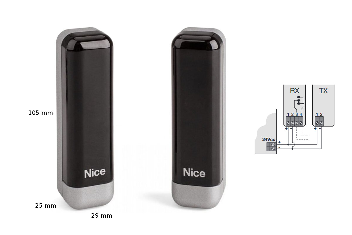 Pár povrchových reléových fotočlánků s LED indikací kvality příjmu paprsku, dosah 30 m, max. odběr 55 mA, rozměry ŠxVxH 29x105x25 mm. Napájení 24 V AC/DC (18 - 35 VDC, 15 - 28 VAC), výstup NC kontakt.