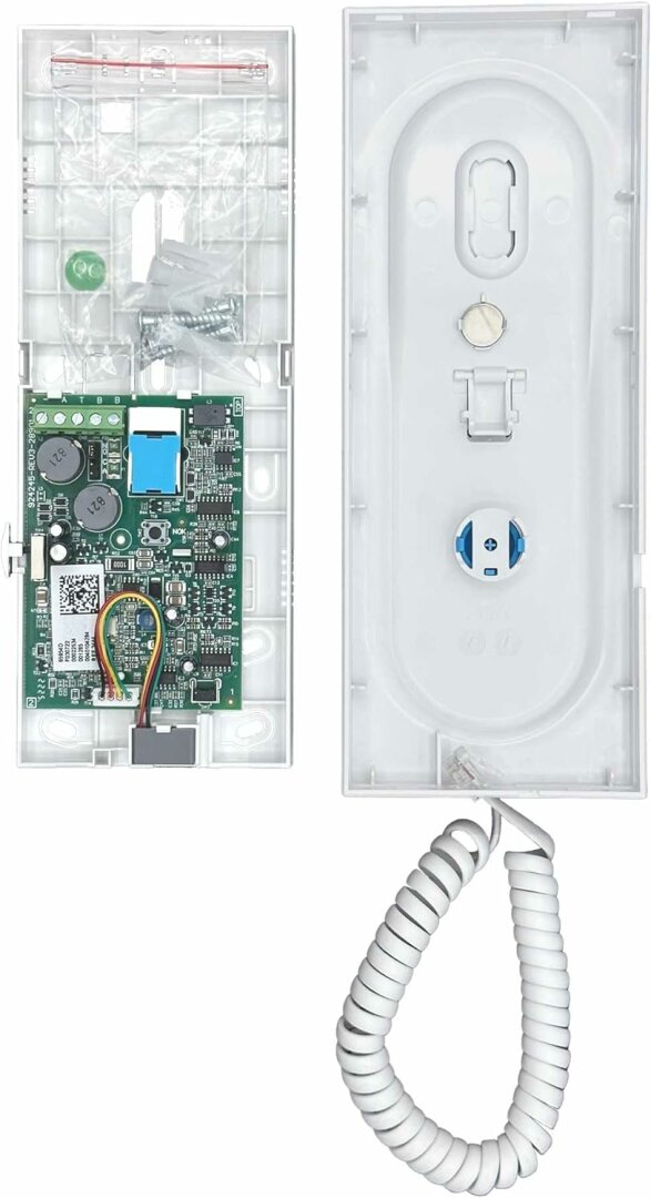 Telefon VEO je vyroben z vysoce odolného ABS plastu. Texturovaný povrch pro snadné čištění a ochranu proti UV záření, aby byl odolnější vůči slunečnímu záření. Jedinečný a exkluzivní design sluchátka obsahuje magnet, který uživateli usnadňuje zavěšení a zajišťuje správné zavěšení na konci hovoru. Jeho vyvážený design čistých linií je výrazný, moderní a minimalistický. Při příjmu hovoru, když je sluchátko zvednuté, začíná konverzace s návštěvou. Hovor se automaticky ukončí po 90 sekundách nebo po zavěšení sluchátka. Chcete-li dveře otevřít, stiskněte modré tlačítko pro uvolnění zámku.