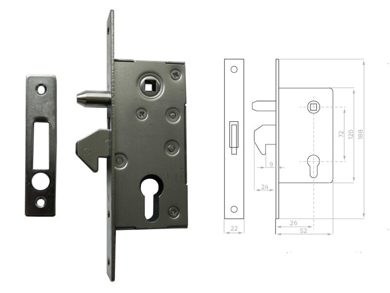 Hákový zámek s trnem do profilu 60 mm pro posuvné brány bez motoru.
