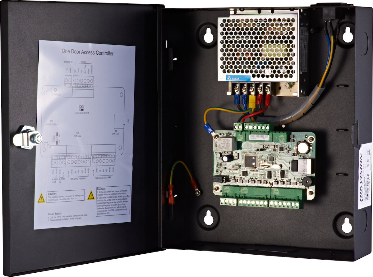 Hikvision DS-K2801 je řídicí jednotka přístupového systému určená pro řízení vstupu přes jedny dveře. Umožňuje připojení až dvou čteček karet (například pro vstup a výstup) a ovládá elektrický zámek nebo jiný přístupový prvek.