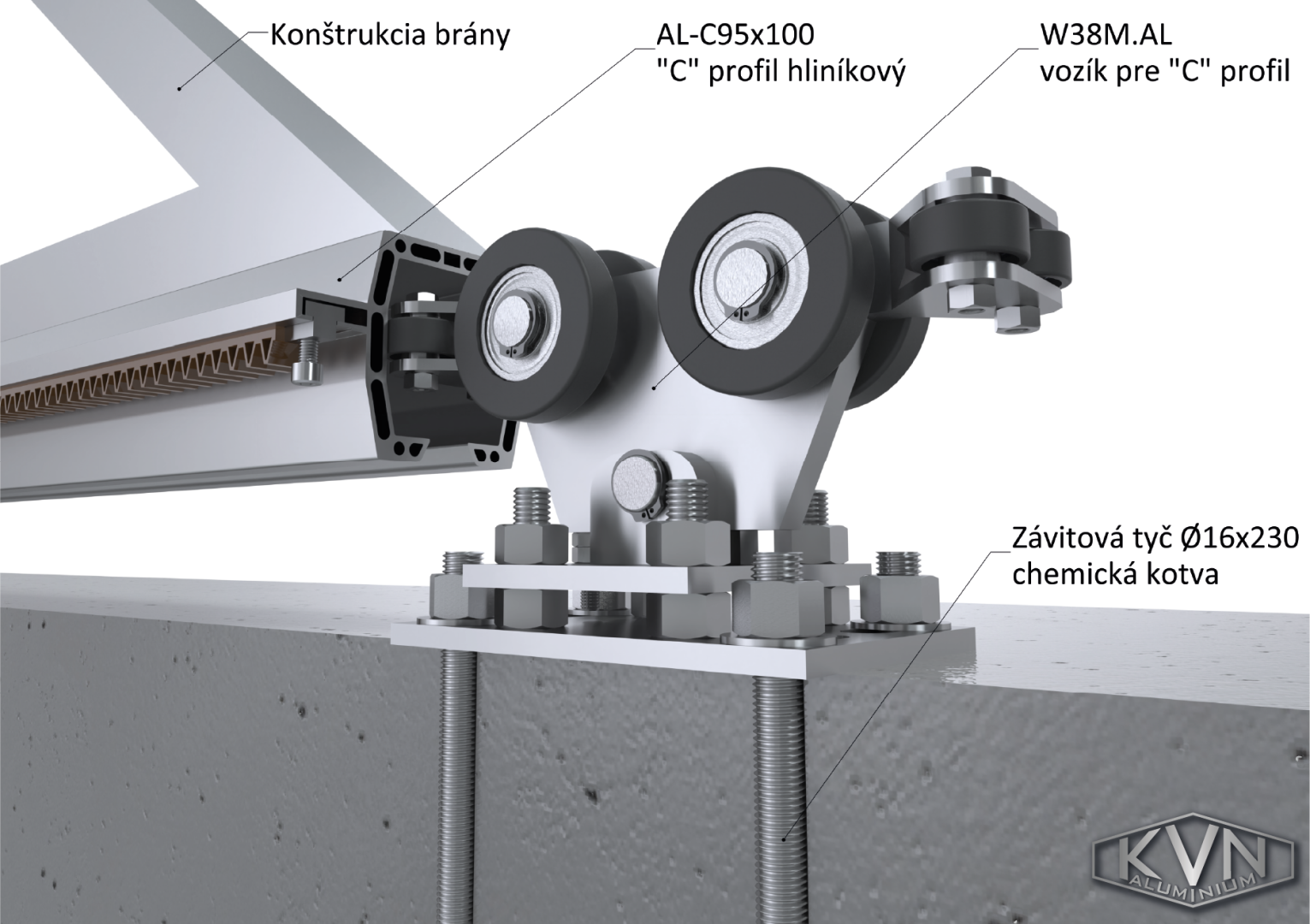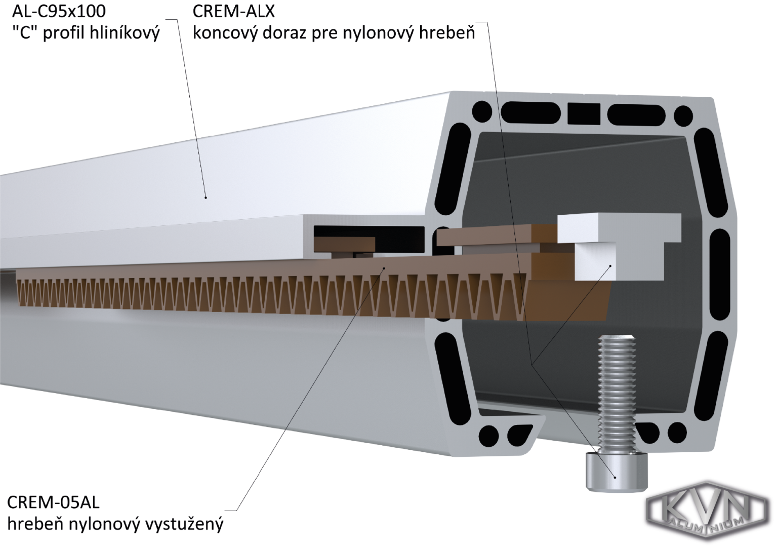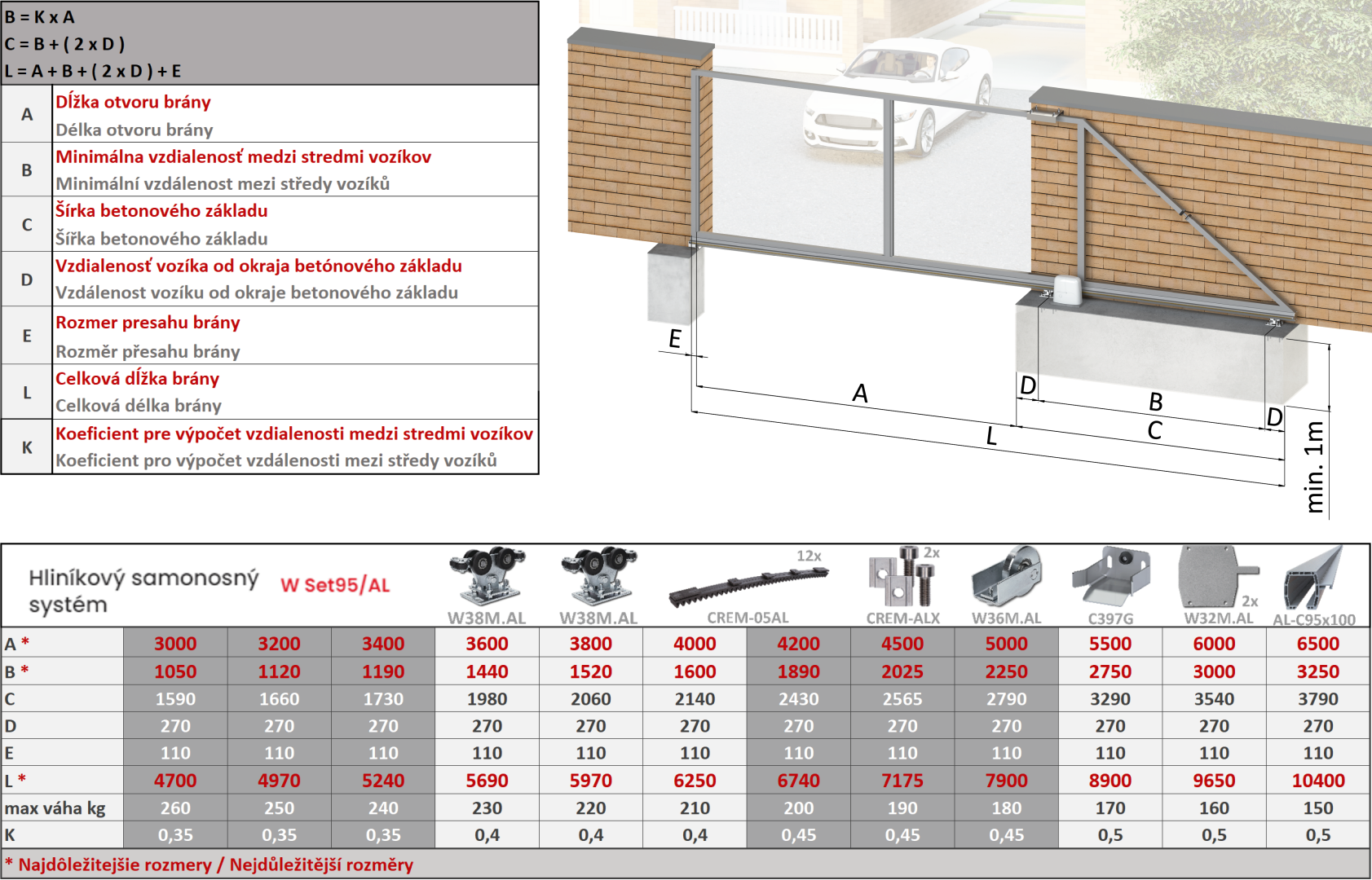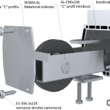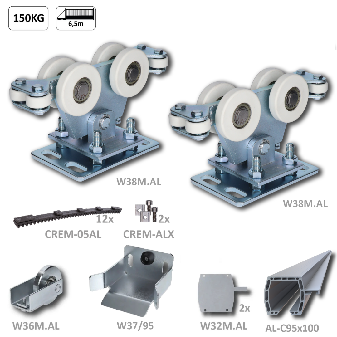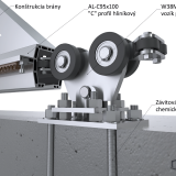 Nový samonosný 6 metrový C profil AL-C95x100 je v nabídce jako set se dvěma unikátně navrženými vozíky s osmi nylonovými kolečky W38M. AL. Právě tato kolečka zaručují tichý a plynulý chod brány. Součástí setu je i náběhové kolečko W36M. AL, 12 polyuretanových hřebenů v délce 50 cm CREM-05AL, 2 koncové zarážky na hřebeny CREM-ALX, 2 záslepky profilu W32M. AL a dojezdová kapsa brány C397G.