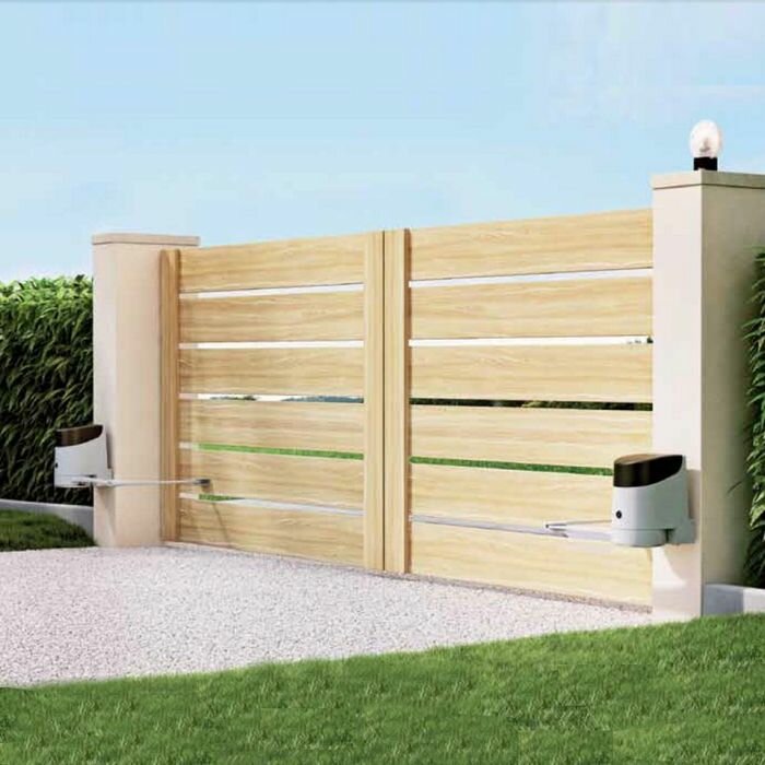 Sada pro křídlové brány s křídly do 2,4 m, i pro velké sloupy a lehké konstrukce.