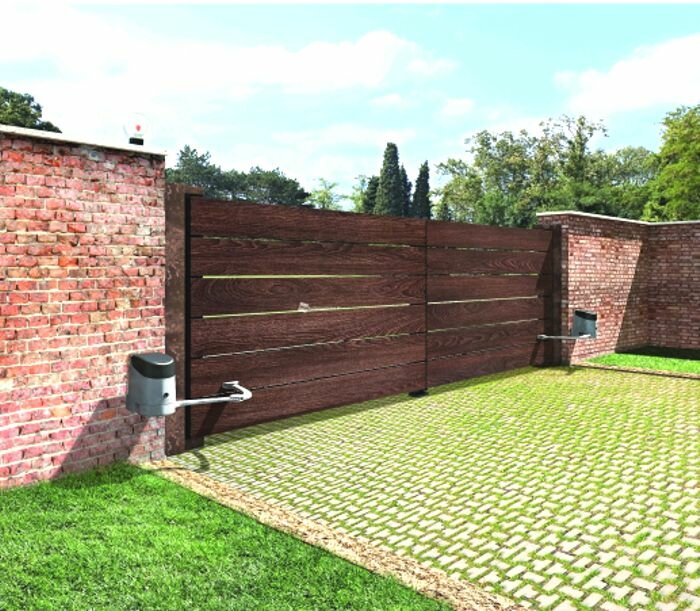Sada pro křídlové brány s křídly do 2,4 m, i pro velké sloupy a lehké konstrukce.