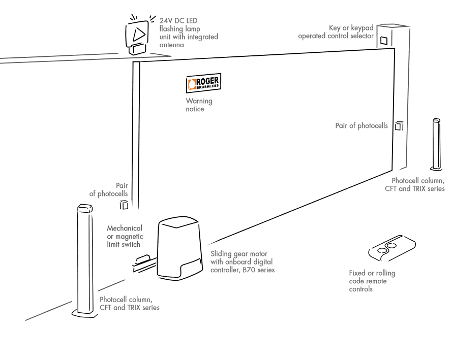 Technologie Brushless je špička mezi pohony. Nízkonapěťové bezkomutátorové motory zvládnou stovky cyklů denně, mají nejpřesnější řízení, velmi tichý chod, velký kroutící moment, vyhodnocení překážek, nezahřívají se, lze je zálohovat bateriemi a jako ostatní motory Roger Technology má řídící jednotka velké množství volitelného nastavení, automatické vyhledání dráhy, průchod pro pěší, diagnostiku atd.