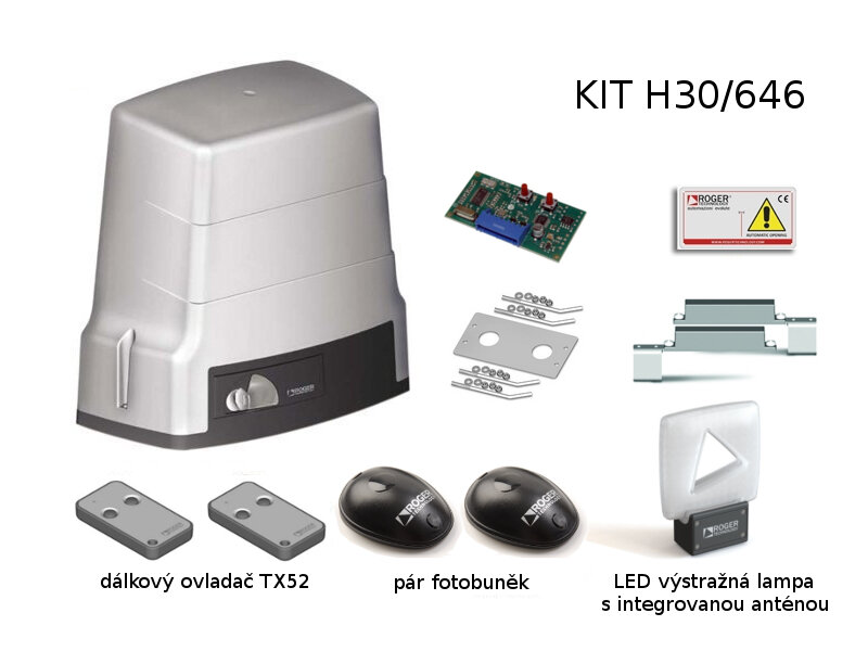 Součástí sady jsou dva dvoukanálové dálkové ovladače E80/TX52R/2, přijímač H93/RX20/I, fotobuňky R90/F2ES a LED výstražná lampa FIFTHY/230 s integrovanou anténou.