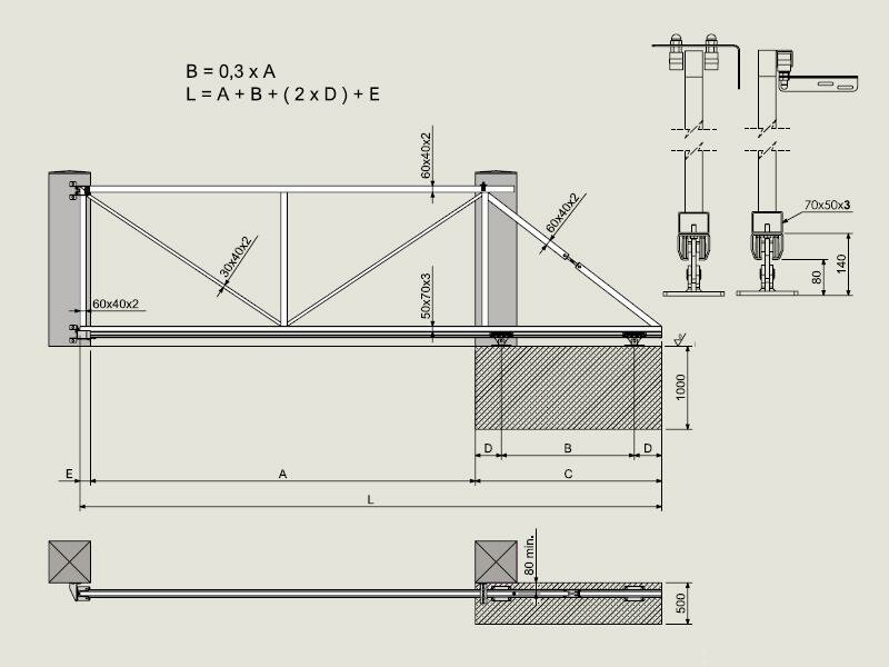 Sada pro privátní brány. Kompletní řešení pro samonosnou posuvnou bránu do hmotnosti 450 kg je sada pohonu a konstrukčních prvků pro výrobu samonosné pojezdové brány. Obsahuje všechno potřebné pro zprovoznění kvalitní samonosné posuvné brány. Součástí dodávky je podrobný návod pro stavební připravenost samonosné posuvné brány a návod pro instalaci a nastavení pohonu. Sadu je možno libovolně kombinovat, měnit počty všech komponent nebo dálkových ovladačů. Výnos do 4,5 m průjezdu. Hřeben je v 1 m kusech a je potřeba o cca 50 cm více, než je šířka průjezdu, tedy pro 4,5 m průjezd 5 m hřebenu.