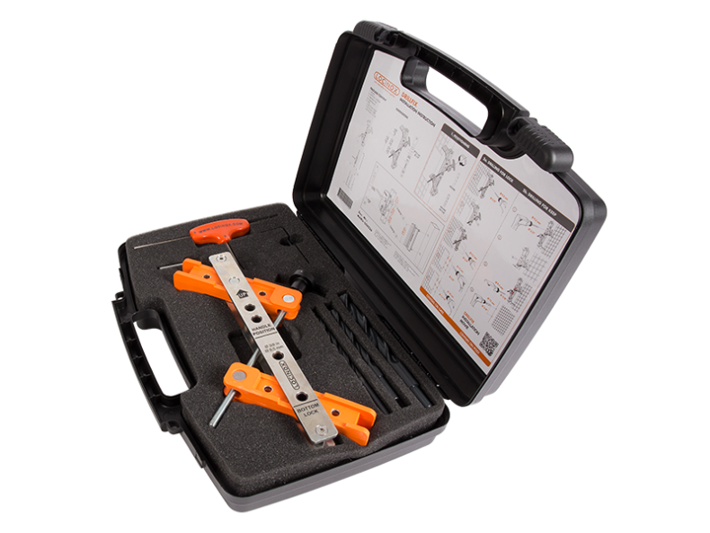 Sada nářadí pro rychlou a přesnou montáž zámků a dorazových lišt LOCINOX®. Pomocí přípravku DRILL-FIX snadno vystředíte a vyvrtáte otvory na kulatý, čtvercový nebo obdélníkový profil. DRILL-FIX se dodává v praktickém a pevném kufříku, který obsahuje potřebné nářadí a nástroje pro instalaci zámků a dorazových lišt Locinox.
