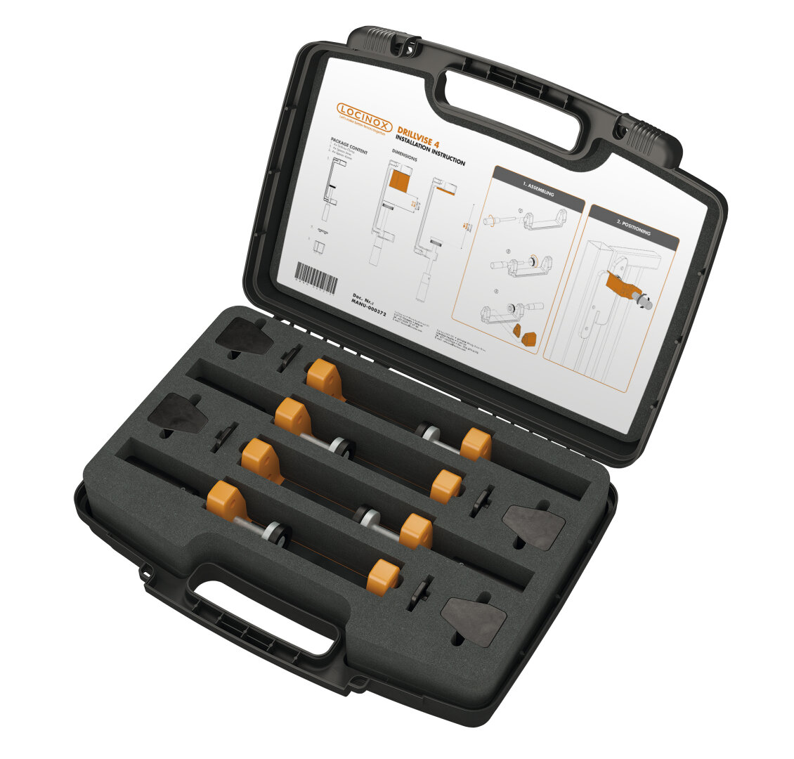 Praktická sada zesílených ocelových svorek pro přípravu před montáží (uchycení a polohování montovaných částí na rám vrat resp. na sloupek). Nářadí LOCINOX® DRILLVISE-4 usnadňuje přípravu a montáž pantů, zavíračů vrat a jiného příslušenství.