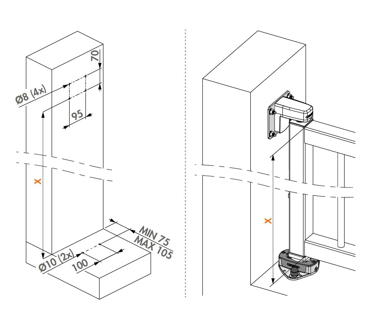 • Vzdálenost mezi bránou a stěnou: min. 29mm - max. 54mm