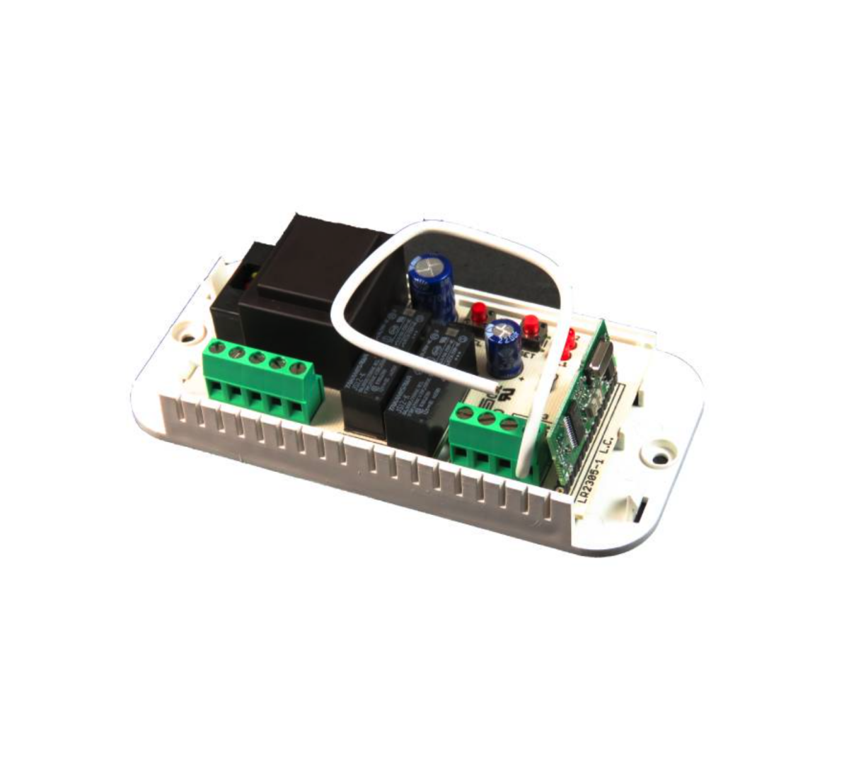 Jednofázová elektronická řídící jednotka pro automatizaci rolet a slunečních clon s integrovaným radiovým přijímačem pro implementaci povelů vysílaných radiovým ovladačem a povelovým tlačítkem.