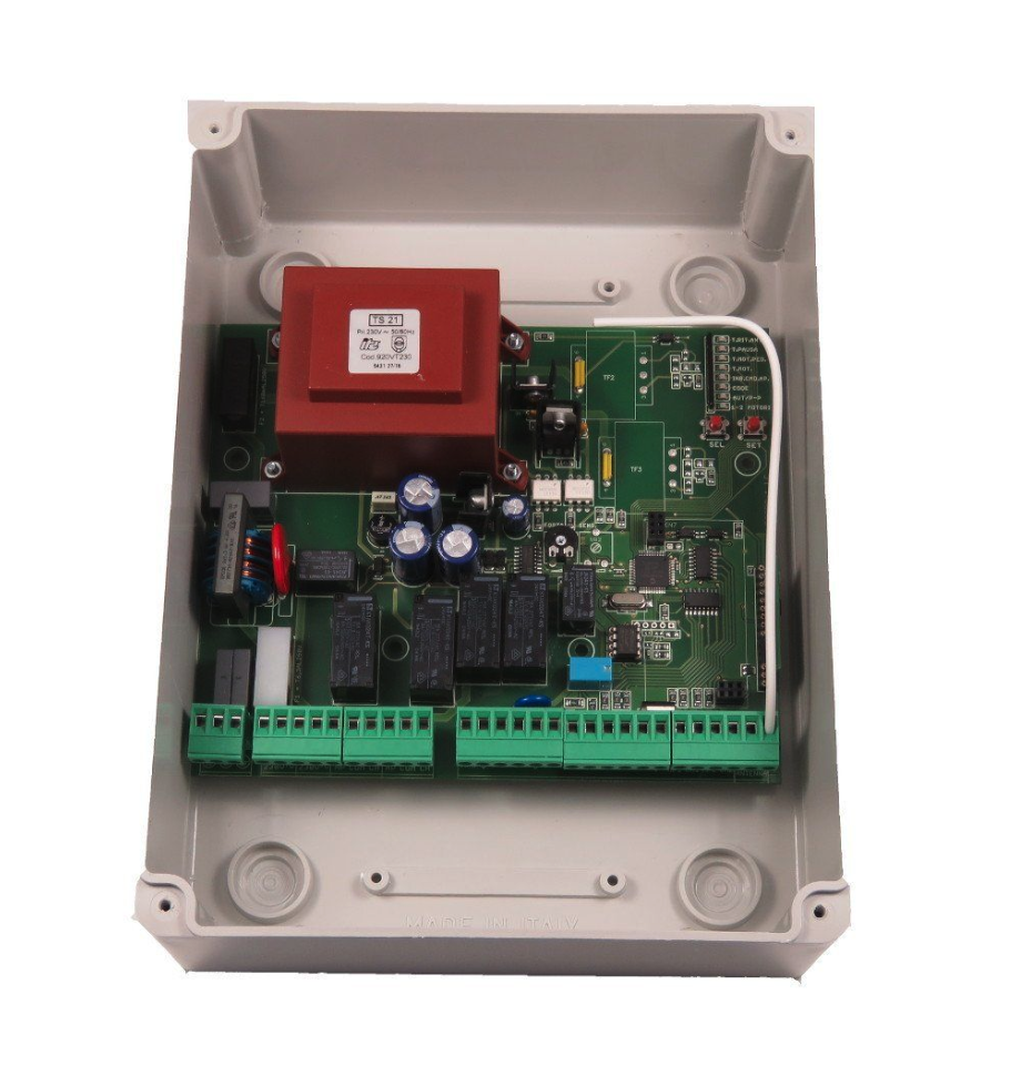 Elektronická řídící deska pro automatizaci posuvných a otočných bran, se zabudovaným radiovým přijímačem. Počáteční posílení motoru, nastavení výkonu motoru, funkce nastavení síly zpomalení, dva koncové spínače pro každý motor.