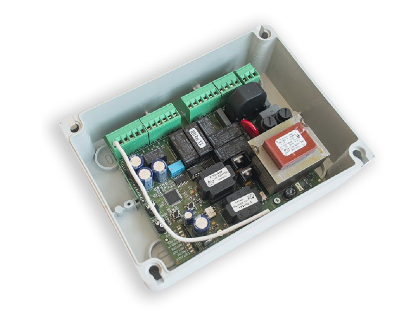 Elektronická řídící deska pro automatizaci otočných bran se zabudovaným radiovým přijímačem. Je vybavena počátečním posílením motoru, nastavením výkonu motoru, programovatelnou silou zpomalení, detekce překážek a zásahu s nastavitelnou citlivostí. Přehled veškerých funkci najdete v přehledné tabulce v příloze.
