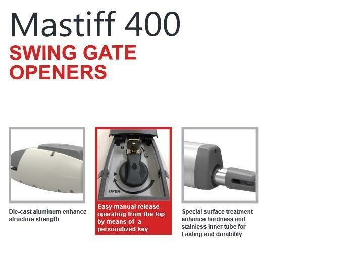 Výrobce pohonů Mastiff400 se vyznačuje dlouholetou tradicí ve výrobě pohonů a zakládá si na kvalitě, ale také funkčnosti svých výrobků. Jedná se o kvalitní pohon s jednoduchou, ale přitom robustní konstrukcí. Píst pohonu je vyroben z kvalitní nerezavějící oceli.
