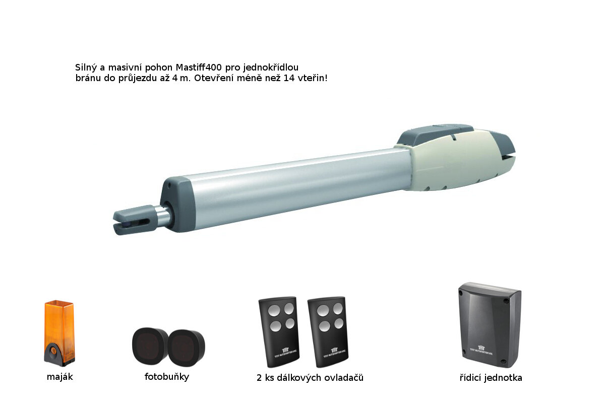 Sada kvalitního pohonu Mastiff400 pro automatizaci jednokřídlé brány do šířky jednoho křídla 3,5 m a do hmotnosti křídla až 400 kg s rychlostí otevření menší než 14s! Nyní navíc se záložní baterií. Díky Wi-Fi IoT se můžete připojit ke své domácí WIFI a ovládat tak bránu ze svého mobilu.
