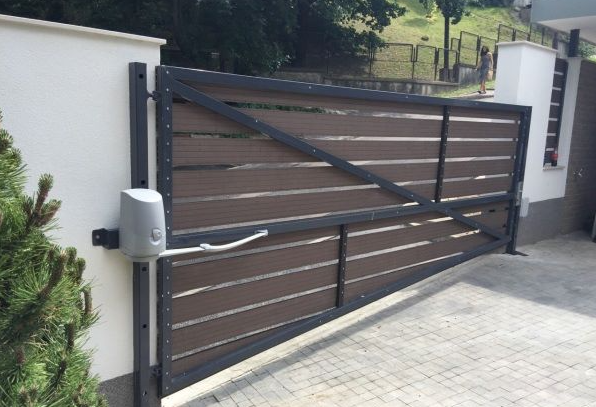 Sada rychlého pohonu Modus420Kit pro automatizaci křídlové brány do průjezdu 4,2 m a hmotnosti 500 kg, možno použít i s tlustými pilíři.