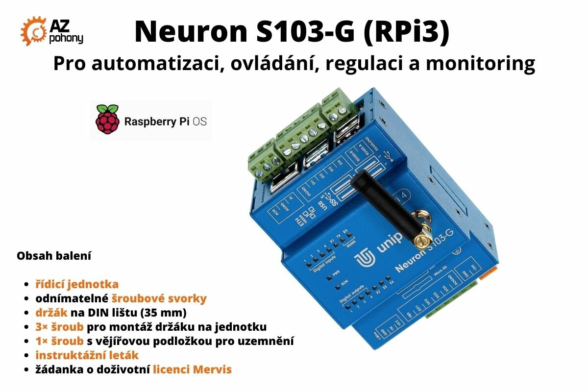 Programovatelný logický kontrolér (PLC) a převodník Unipi Neuron S103-G je navržen pro automatizaci, ovládání, regulaci a monitoring. Model S103-G je vybaven univerzální kombinací vstupů a výstupů, která zahrnuje digitální i analogové vstupy a výstupy a je dostačující pro jednoduché instalace. Speciální vlastností modelu S103-G je integrovaná komunikace přes bezdrátovou síť GPRS/GSM pro odesílání a přijímání SMS nebo pro připojení k internetu. Vedle toho je jednotka vybavena sériovým rozhraním RS485 a rozhraním 1-Wire pro připojení digitálních čidel teploty a vlhkosti.