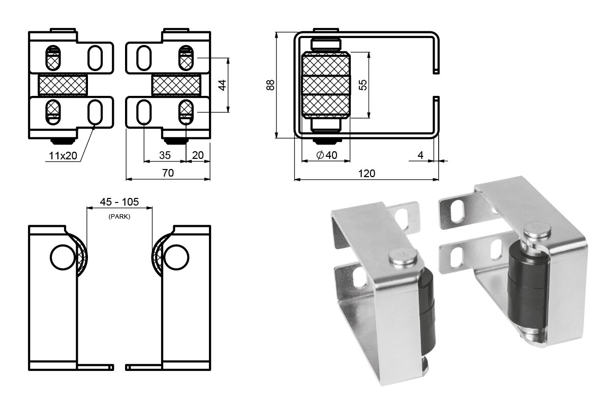 Stavitelný koncový doraz pro posuvnou bránu, minimální vnitřní rozměr 45 mm, lze umístit na konzolu PARK.