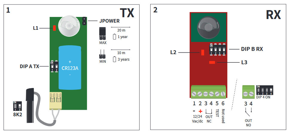 Opravdu špičkové bezdrátové fotobuňky, které splňují nejnovější normy v oblasti bezpečnosti - PHOTO DB PLUS napájené 3V baterií CR123A (1 ks je součástí dodávky). Tato baterie vydrží cca 3 roky dle výkonu. Sada je složená z vysílače(TX) a přijímače(RX). Dosah až 10 m pro standartní podmínky. Seřiditelné až o 180 stupňů.