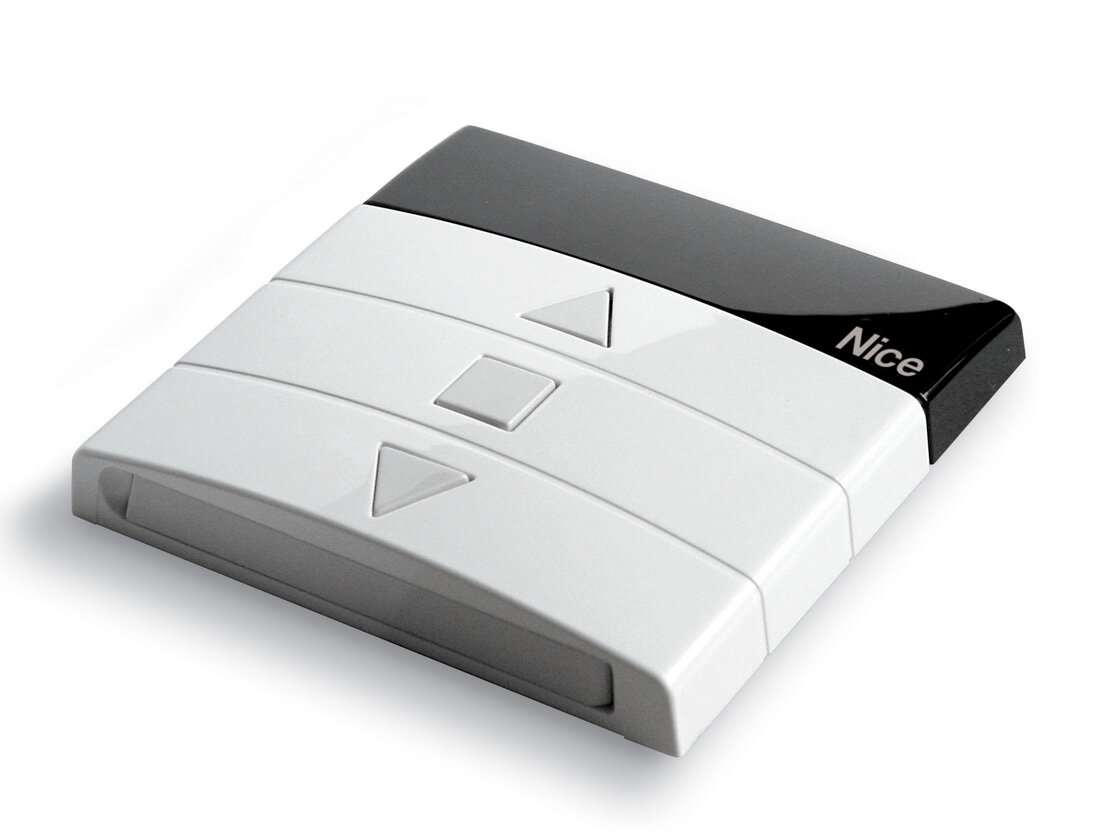 Panelový vysílač na zeď s plovoucím kódem pro ovládání řídící jednotky, intuitivní ovládání, funkce NAHORU-DOLU-STOP, módy "vítr" a "slunce a vítr", frekvence 433.92 Mhz, lithiová baterie.