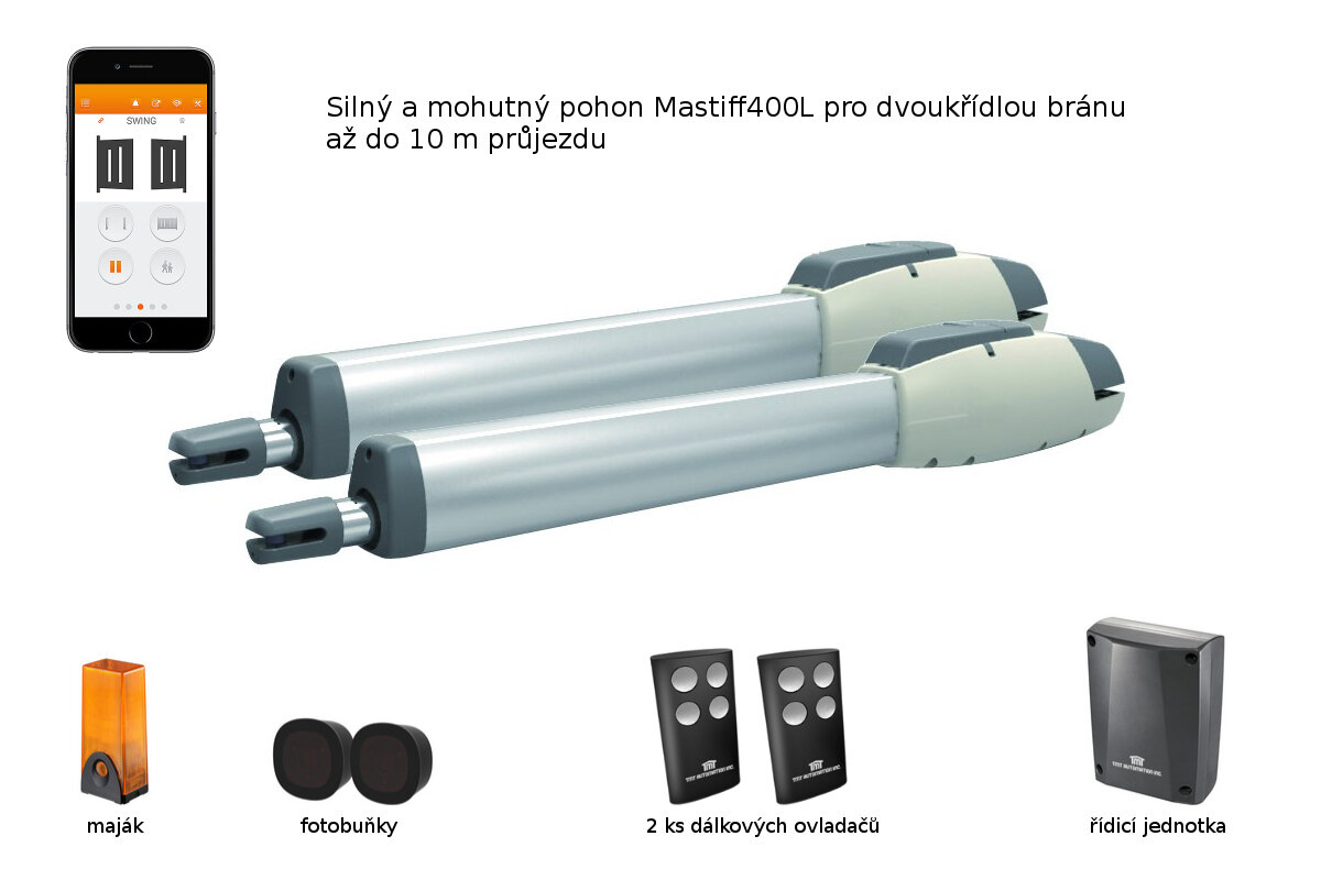 Sháníte kvalitní pohony pro automatizaci velké dvoukřídlé brány? Sada s pohony Mastiff400L do šířky jednoho křídla 5 m (10 m průjezdu) a do hmotnosti jednoho křídla až 450 kg je skvělou volbou. Výhodou je síla pohonu a modul Wi-Fi IoT již v základním provedení. Kromě samotného pohonu sada obsahuje také 2 ks ovladačů, fotobuňky a výstražnou lampu. Síla 4500N.
