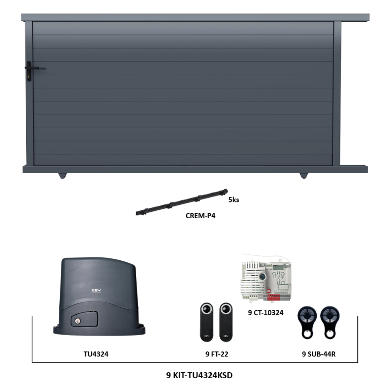 Tento konkrétní produkt nabízíme jako kompletní set včetně pohonu 9 KIT-TU4324KSD a 5 ks ozubeného hřebene CREM-P4 pro automatický provoz brány.