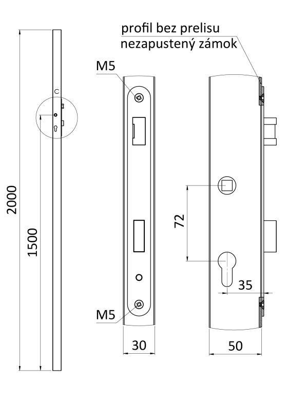 Profil 50x30x1,5 mm H-2000 mm se zámkem, vhodný pro rám branky, bez povrchové úpravy, zámek nemá prolisovaný profil pro zapuštění