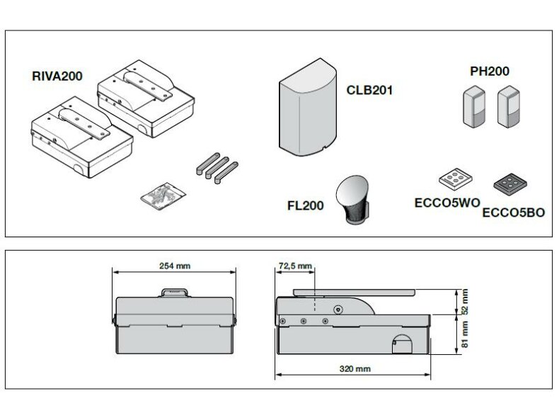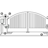 Sestava pro dvoukřídlou bránu - podzemní pohony 24V, šířka křídla do 2,3 m, hmotnost do 400 kg (závisí na délce křídla), úhel otevření max. 180°, mechanické odblokování při výpadku napájení.