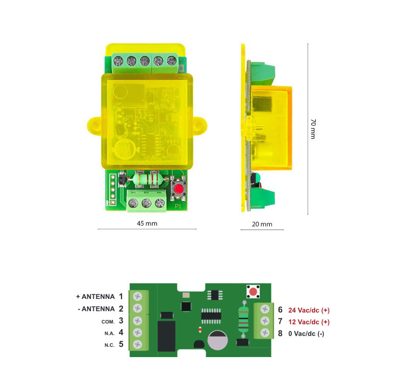 RX1ONE - jednokanálový přijímač, univerzální, dokáže se naučit různé pevné kódy (použít ale umí jen ten první naučený, pro více různých pevných kódů používaných zároveň vyberte RX2 nebo RX4). Výstupem je jedno spínací relé.