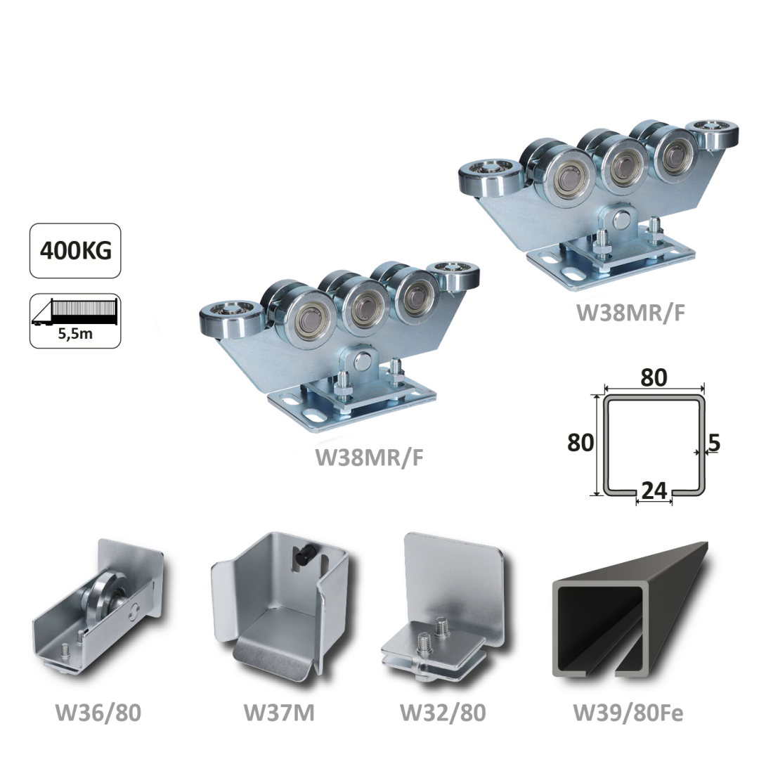 Samonosný systém 80x80x5 mm pro posuvné brány do 400 kg / 5,5 m otvor (W39/80Fe 6 m černý profil, 2x W38MR/F, 1x W36/80, 1x W37/M, 1x W32/80)