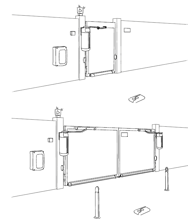 • 2 ks - SL/180/R – elektromechanický bezkartáčový pohon (reverzní) s integrovaným měničem, enkodérem a montážní deskou na sloupek.