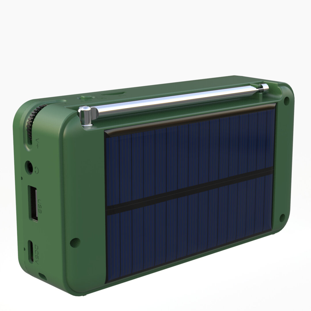 Zařízení je vybaveno LCD displejem, integrovaným reproduktorem a dobíjecí lithium baterií. Rádio lze dobíjet pomocí USB-C konektoru nebo vestavěného solárního panelu, což je ideální například při výpadku elektřiny, při pobytu v přírodě nebo v krizové situaci.