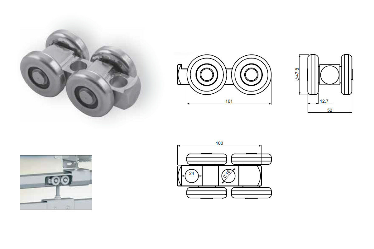 Závěsná čtařkolečková ložisková kladka SPEED C do profilu typu STAGE S o průměru 73 mm, nosnost a více informací včetně rozměrů v obrázku.