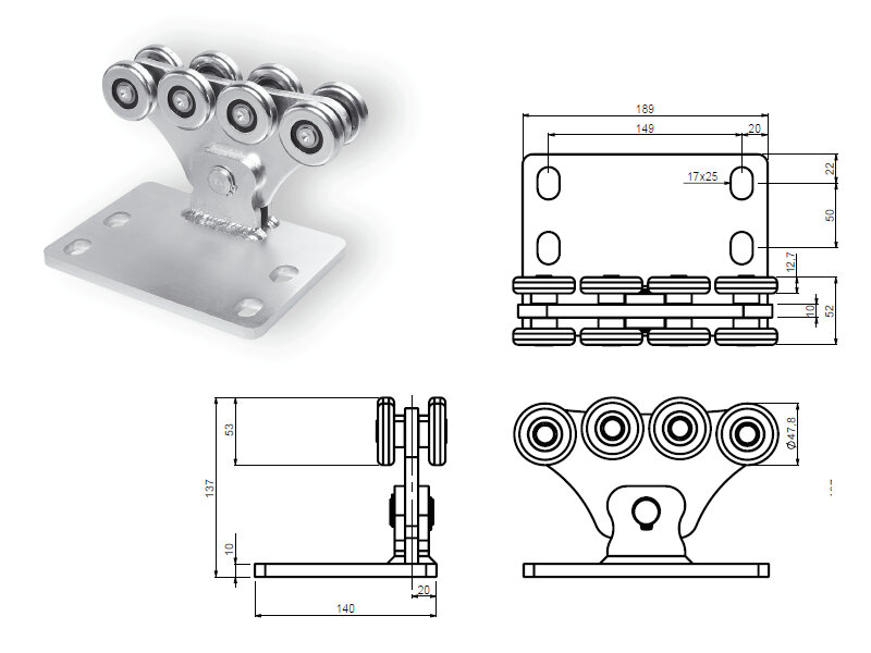 SPEED SK - nosný vozík osmikolový pro bránu ve svahu. Určen pro C profil SPEED S 73x61x3,5 mm.