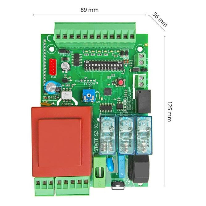 Řídící jednotka pro posuvnou bránu včetně přijímače. Disponuje všemi běžnými i nadstandartními funkcemi. Výstupní napětí 230 VAC. Dodávka včetně přijímače pevných kódů na frekvenci 433,92 MHz (zapojuje se na červeném konektoru součástkami směrem doprostřed řídicí jednotky). Vhodné ovladače jsou např. T4.