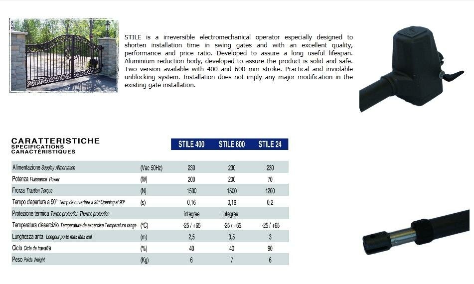Sada pohonu Stile600Kit pro automatizaci dvoukřídlé brány do šířky jednoho křídla 3,5 m a do hmotnosti jednoho křídla až 300 kg.